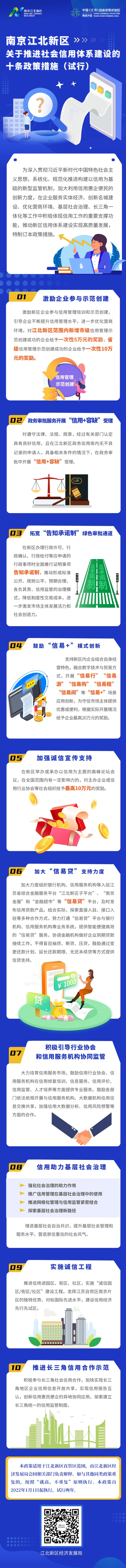 为系统化、规范化构建以信用为基础的新型监管机制,加大利用信用惠企便民的创新力度,江北新区经济发展局会同相关部门制定了《南京江北新区关于推进社会信用体系建设的十条政策措施(试行)》。该政策体现了信用工作在企业服务实体经济、创新名城建设、优化营商环境、基层社会治理、长三角一体化等方面的重要支撑作用,为营造新区社会信用建设浓厚氛围,推动新区信用体系建设、实现高质量发展具有深远意义。