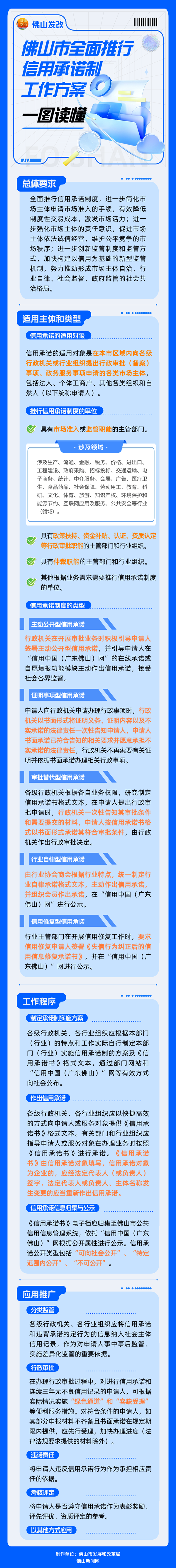 为加快推进全市社会信用体系建设,近日,佛山市社会信用体系建设统筹协调小组办公室印发实施《佛山市全面推行信用承诺制工作方案》,明确五类信用承诺适用场景及相应承诺内容要求,并理清信用承诺流程。